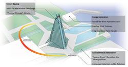 Situated on the former site of the Shanghai 2010 World Expo, this master plan for a new technology-focused university would utilize the remaining pavilions and stadium from the World Expo, as well as add additional buildings for education, commercial offices, retail, housing and hospitality. The focus for the plan of Shanghai World University was for it to operate it at Net-Zero Energy and Water, mainly from turbines that generate power from the flow of the Huangpu River. Additionally, separate "sponge rivers" collect the river-water from these turbines and cleanse it through natural vegetative filtration before returning the water.